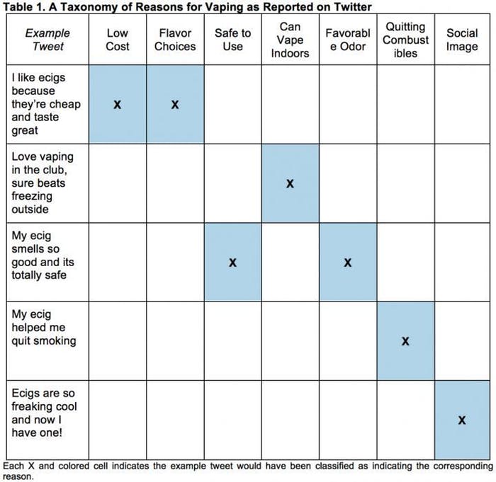 The researchers reached this conclusion using Twitter, mining through 3 million tweets from those two years that included keywords like “electronic cigarette,” “e-cigs,” and “vaping.” Then, with the help of Amazon’s Mechanical Turks, they analyzed the content of the tweets and categorized them by common reasons for vaping (listed in the chart below). To preserve the anonymity of the Twitter users, the researchers didn’t include the actual tweets in their study, but they didprovide samples that they thought had the same essence. Sample sentiments included: “love vaping in the club” and “ecigs are so freaking cool and now I have one!”