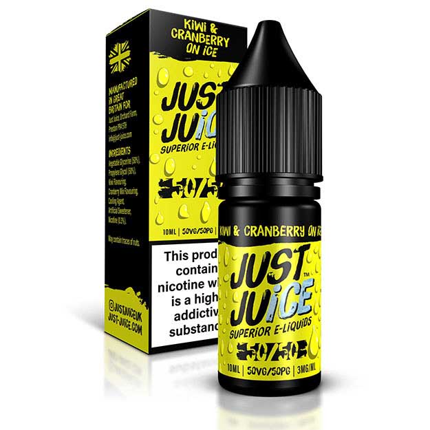 Just Juice – 50/50 – Kiwi and Cranberry Ice – Exotic kiwis are mixed with freshly picked cranberries in this colada-infused vape 50/50 e liquid juice. You get a sweet, sour and icy inhale, leaving your mouth feeling refreshingly fruity long after. Premium quality e-liquid.