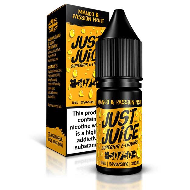 Just Juice – 50/50 – Mango and Passionfruit – If you’re into your tropical fruits, you’ll love this delicious nic salt e liquid blend. It hits you with a sweet and juicy mango treat on the inhale, with an equally exotic tart passion fruit aftertaste that lingers. Premium quality e-liquid