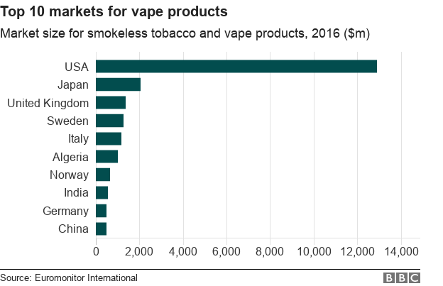 The United States, Japan and the UK are the biggest markets. Vapers in the three countries spent a combined $16.3bn on smokeless tobacco and vaping products in 2016. European countries such as Sweden, Italy, Norway and Germany also feature in the top 10.